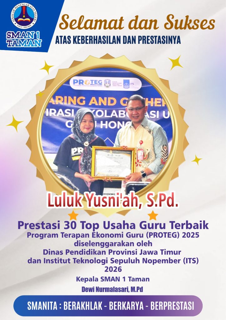 Dari proses panjang tersebut, kembali dilakukan seleksi hingga akhirnya terpilih 30 Top Usaha Guru PROTEG 2025. Alhamdulillah, saya termasuk di dalamnya. Bersama rekan saya dari SLB Gedangan, kami berhasil mewakili Kabupaten Sidoarjo dan membawa nama baik sekolah SMA Negeri 1 Taman serta Cabang Dinas Sidoarjo dalam ajang Sharing and Gathering 30 Top Usaha Guru PROTEG 2025.
