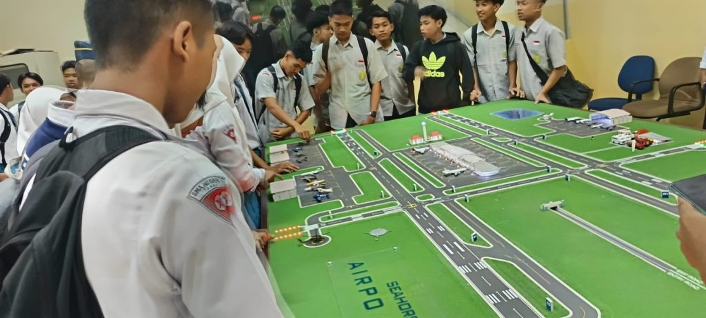 Siswa SMAN 1 Taman antusias dalam memperhatikan simulasi lalu lintas udara didalam Laboratorium Prodi TNU (Teknologi Navigasi Udara)