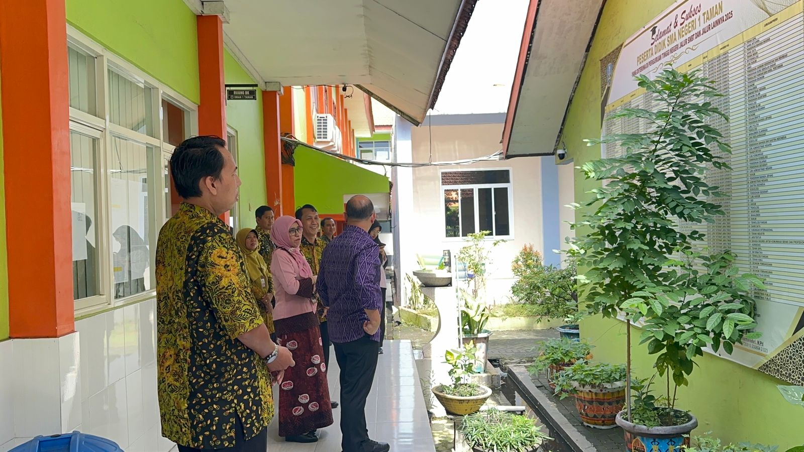 Kepala Dinas Pendidikan Provinsi Jawa Timur, DR. Aries Agung Paewai, S.STP., MM., memberikan semangat dan motivasi kepada para tenaga pendidik saat melakukan kunjungan dinas ke SMAN 1 Taman pada Kamis (3/3/2026).